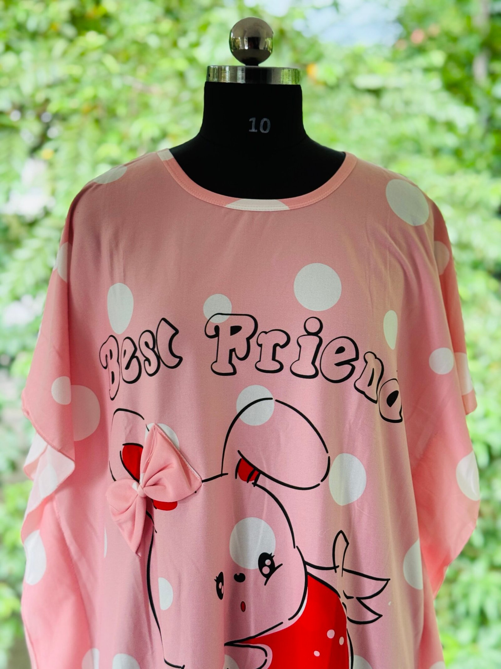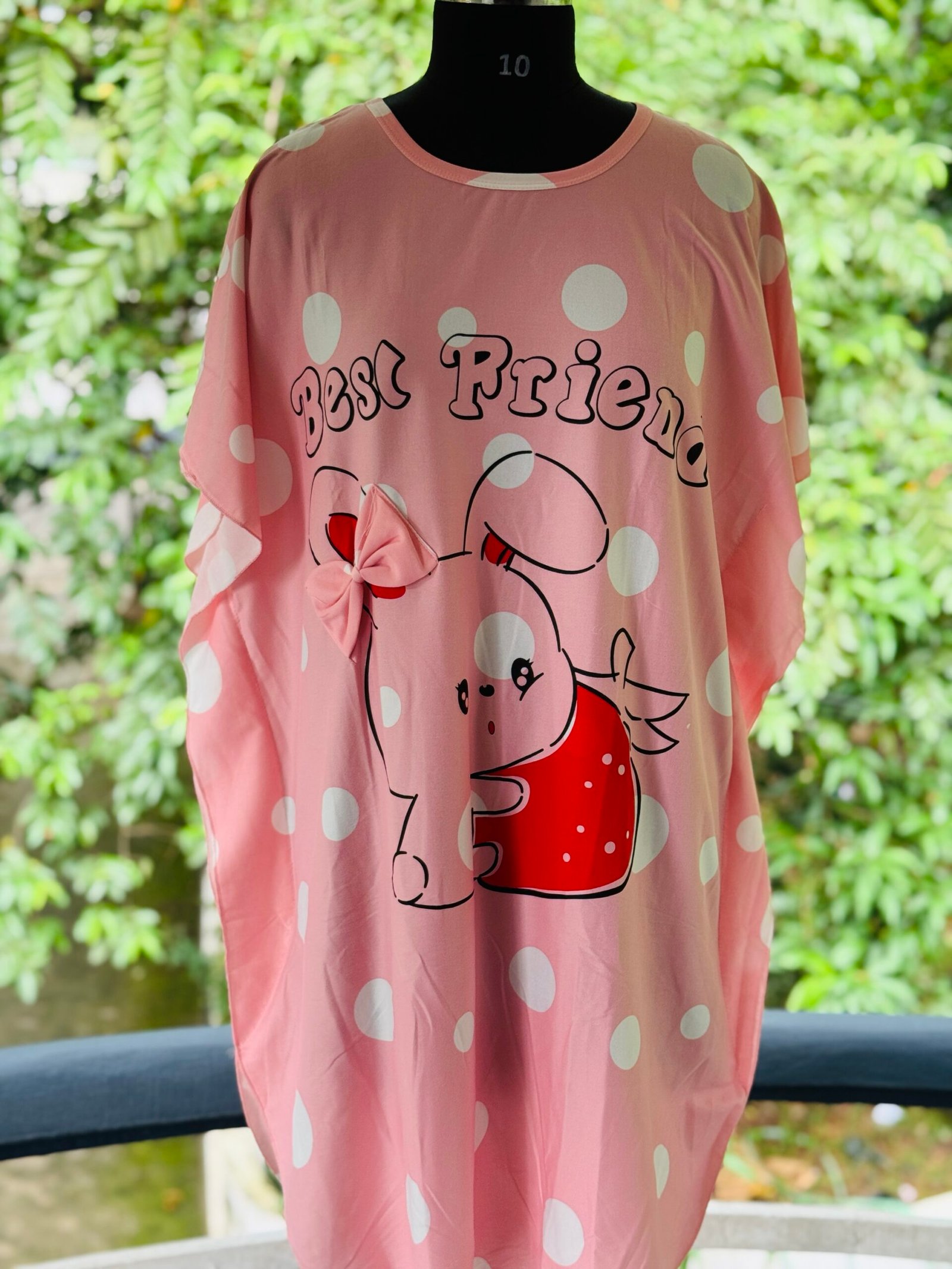 Crafted from premium imported Korean fabric, this elegant kaftan maxi offers luxurious comfort and style. Designed in a free size fit to flatter all body types, it features a flowing silhouette with a length of 45 inches, making it perfect for relaxed evenings or bedtime.