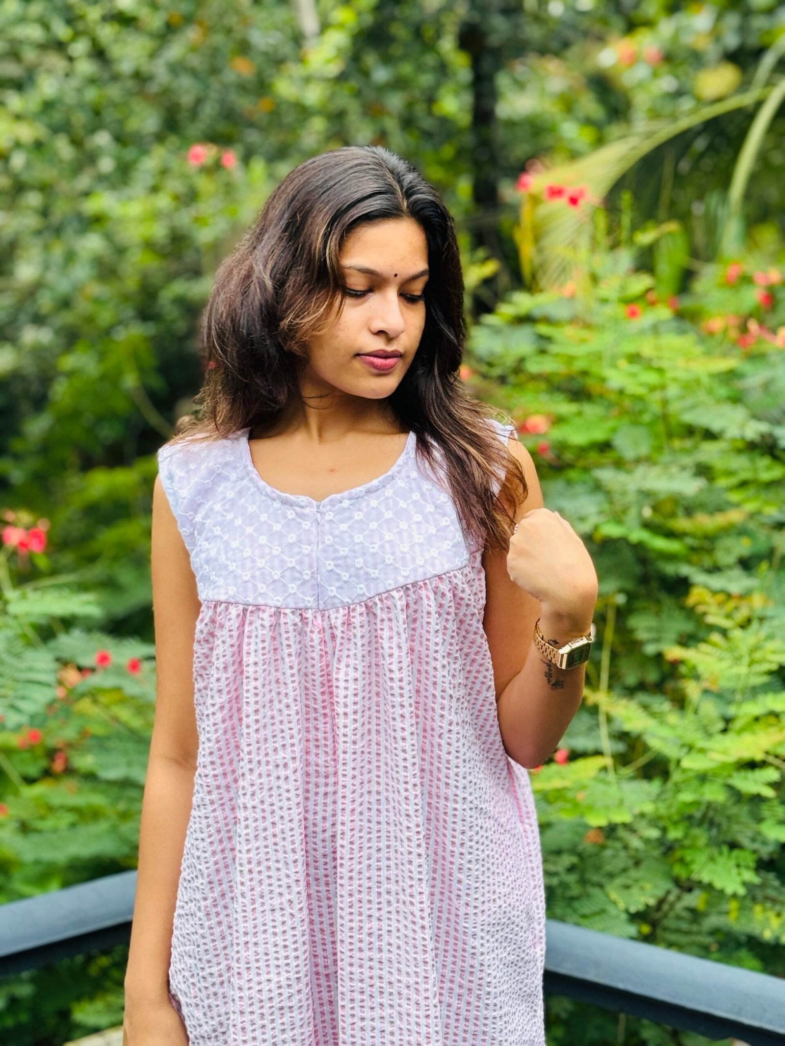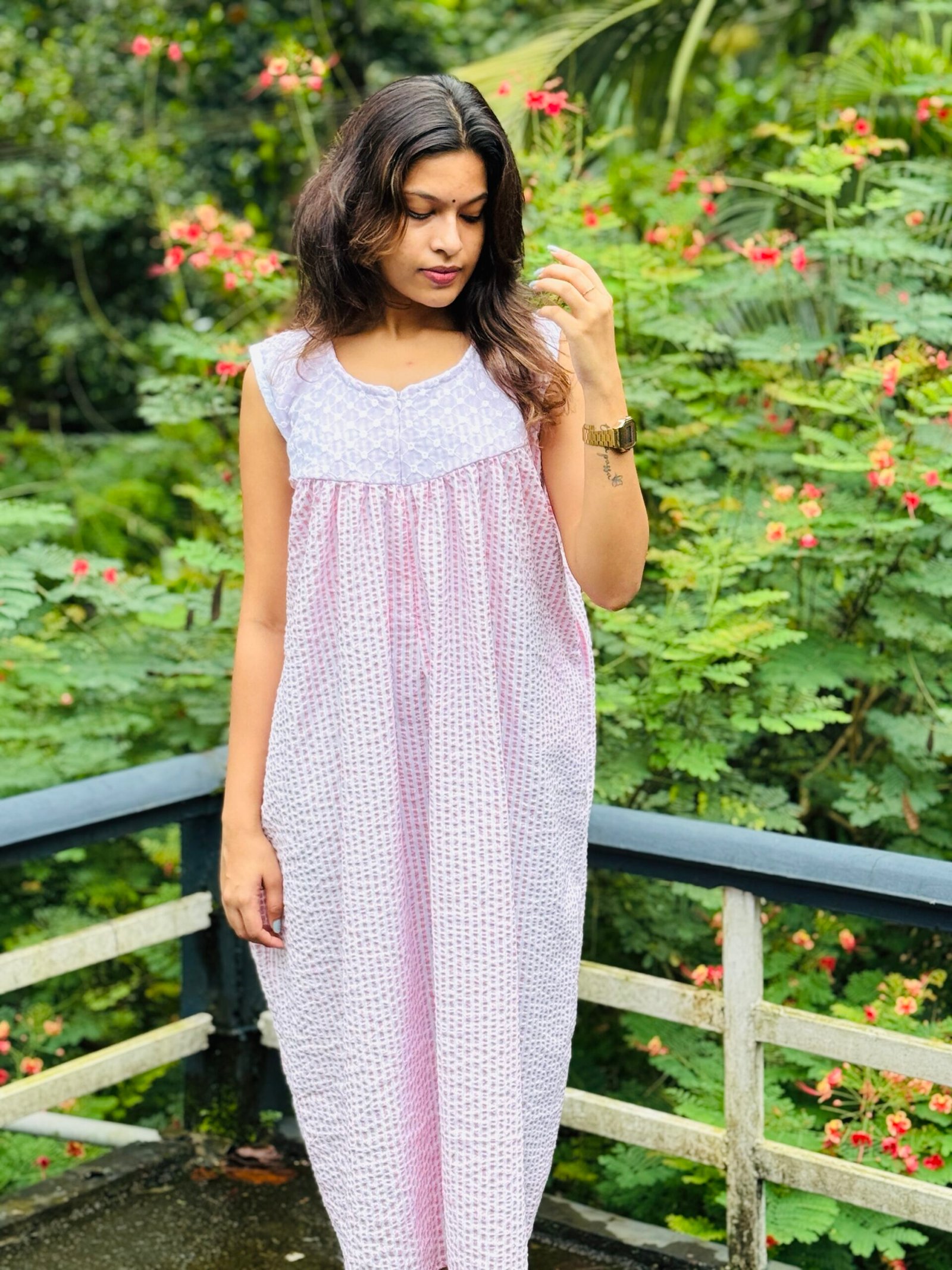 Upgrade your nightwear with this elegant, breathable frock made from luxurious bubble cotton for all-night comfort. The beautifully detailed Hakkoba yoke with fine pleating adds a handcrafted, premium touch — making it perfect for new moms and everyday lounging.