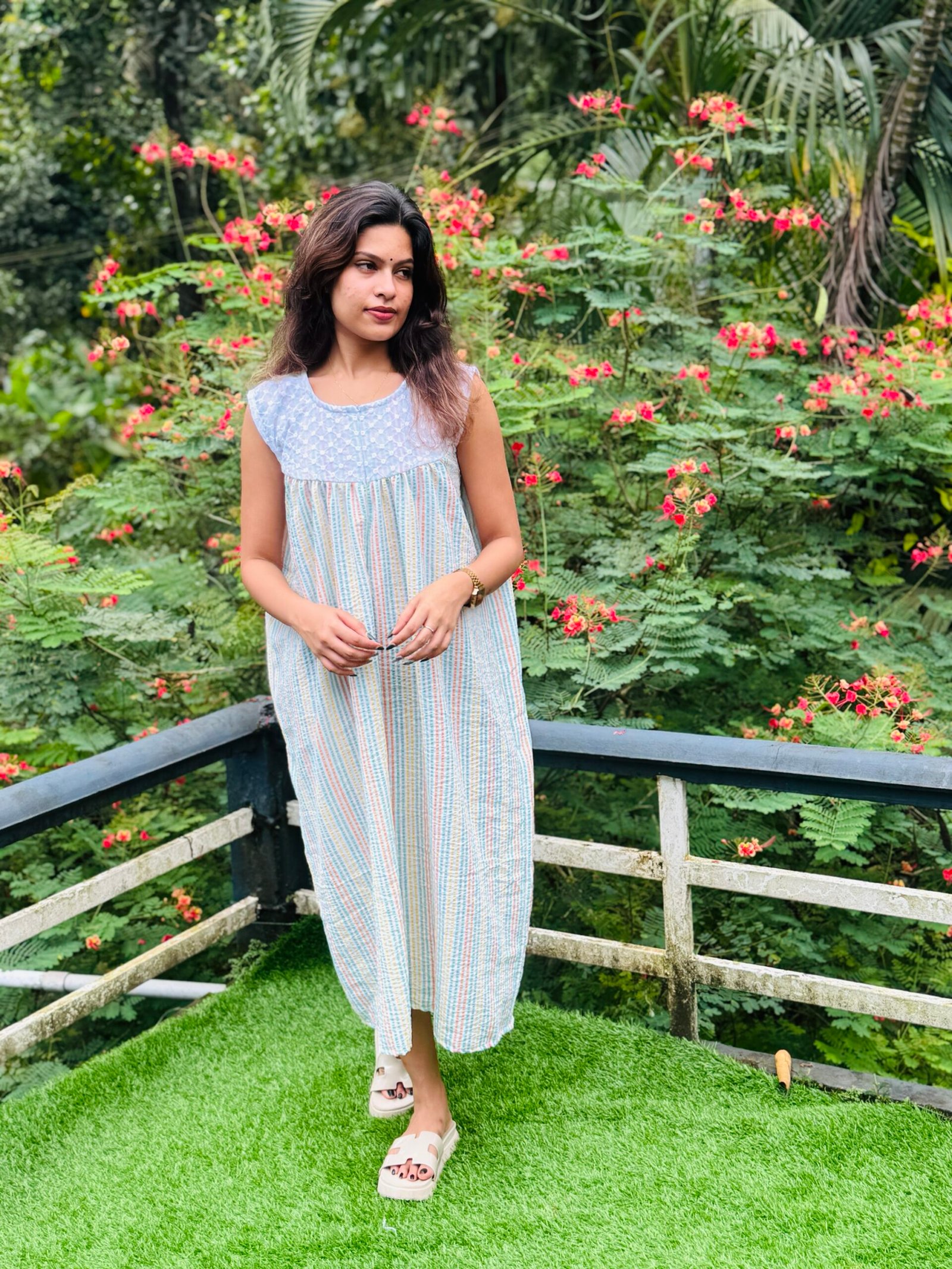 Elevate your loungewear with this elegant night frock, crafted from premium bubble cotton for unmatched comfort and breathability. The beautifully attached Hakkoba yoke adds a subtle handcrafted charm, while thoughtful features make it perfect for both new moms and everyday wear.