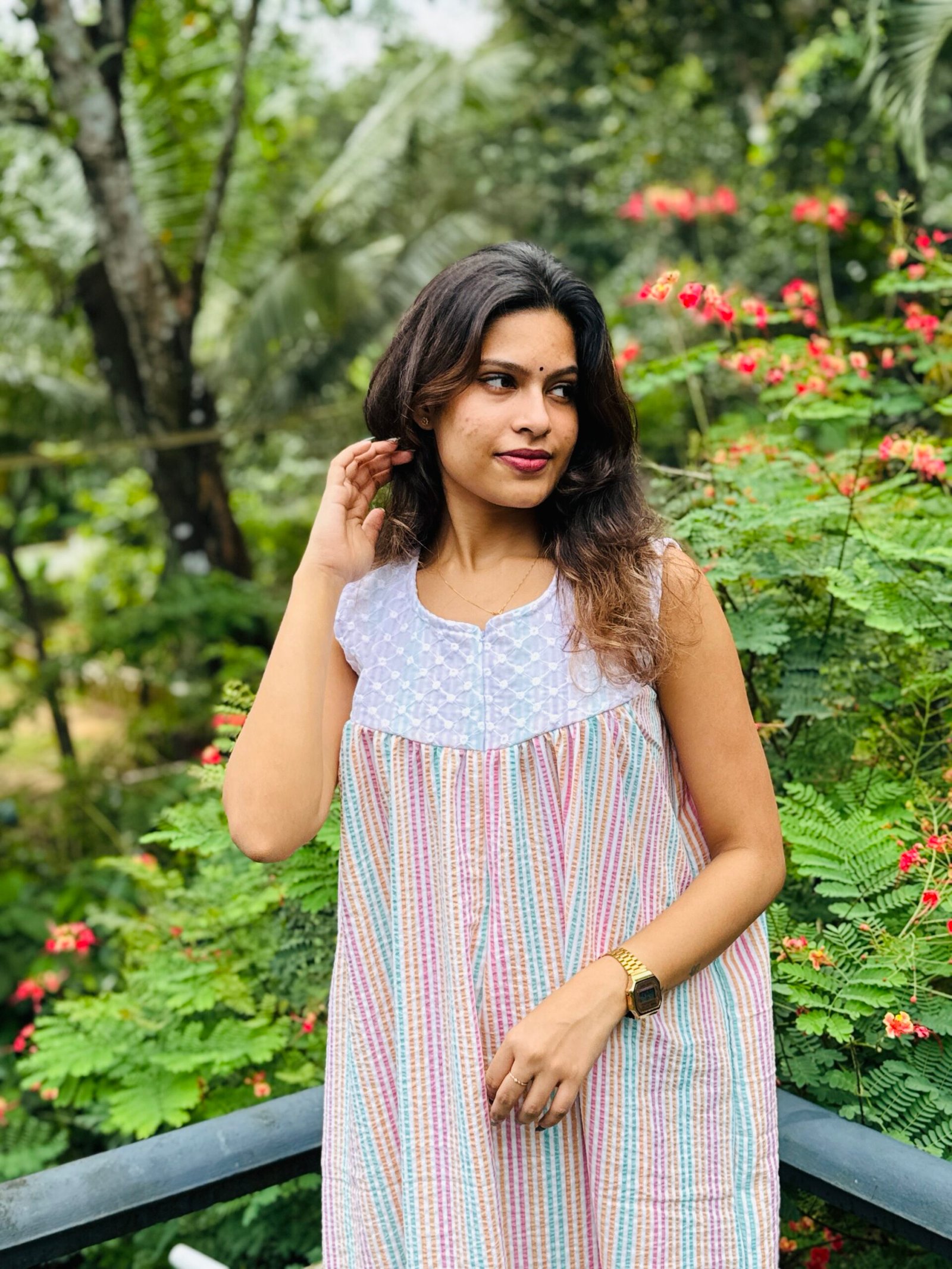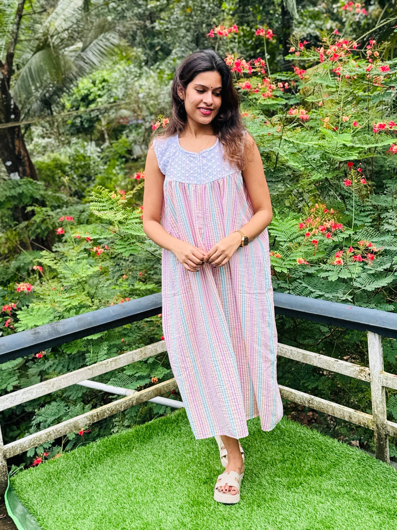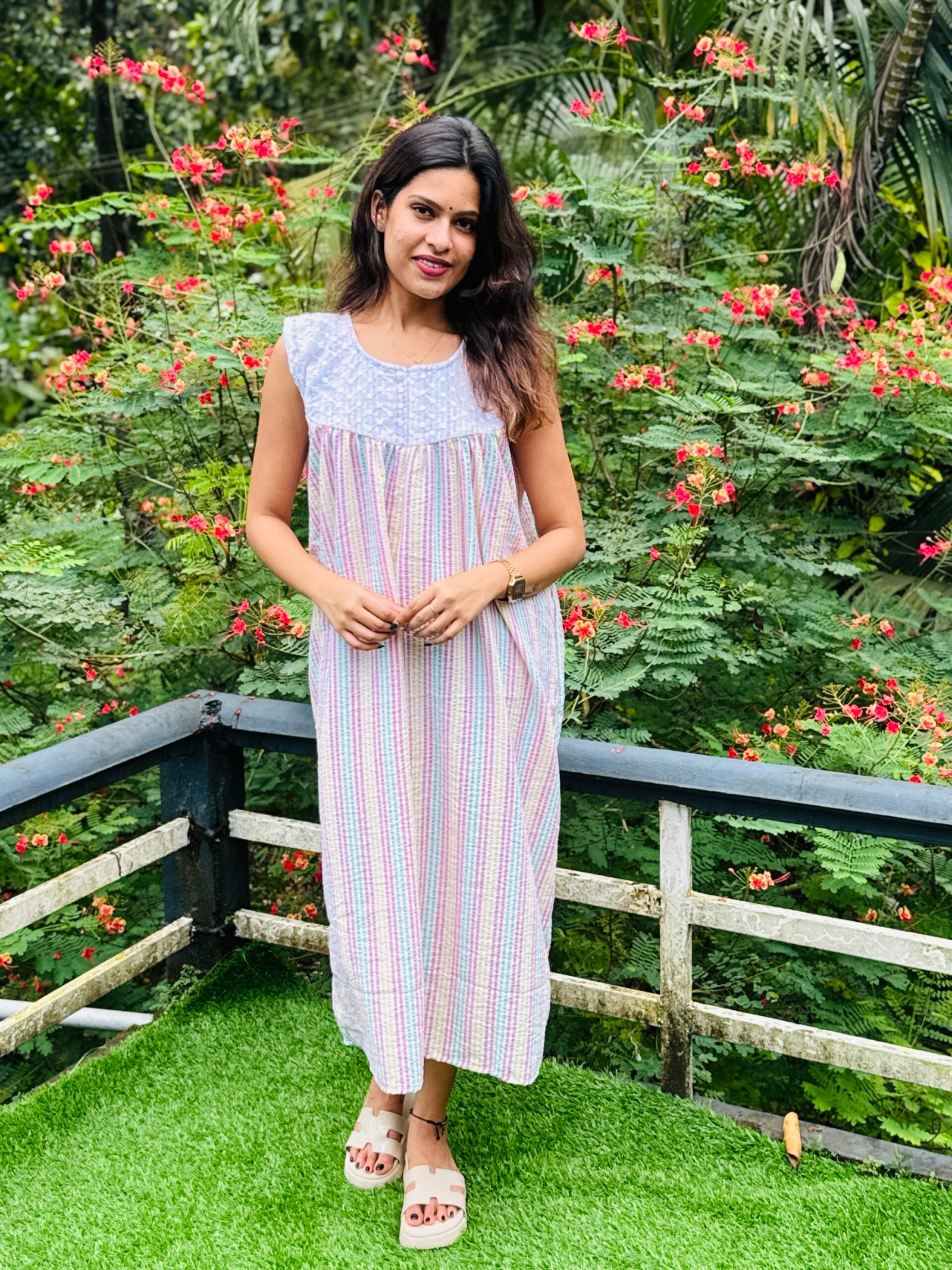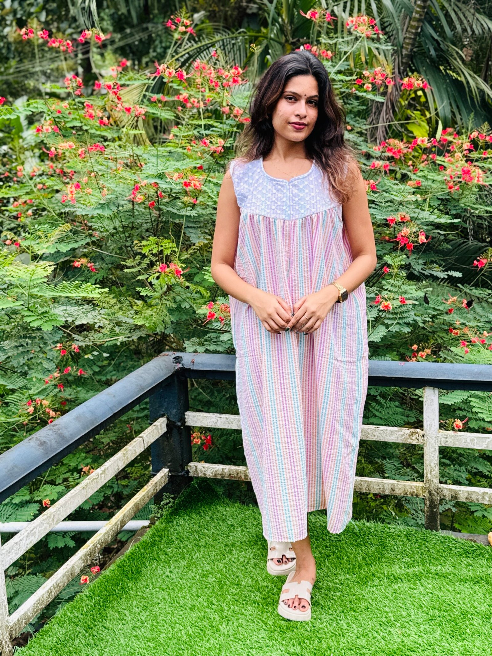 Elevate your loungewear with this elegant night frock, crafted from premium bubble cotton for unmatched comfort and breathability. The beautifully attached Hakkoba yoke adds a subtle handcrafted charm, while thoughtful features make it perfect for both new moms and everyday wear.