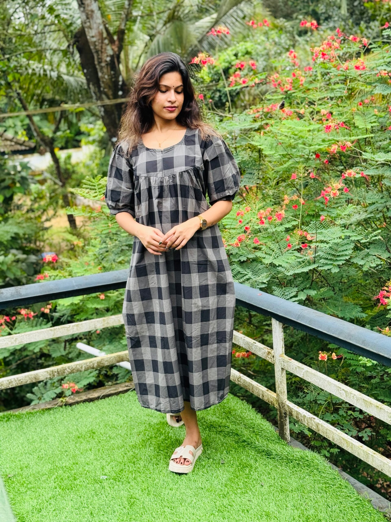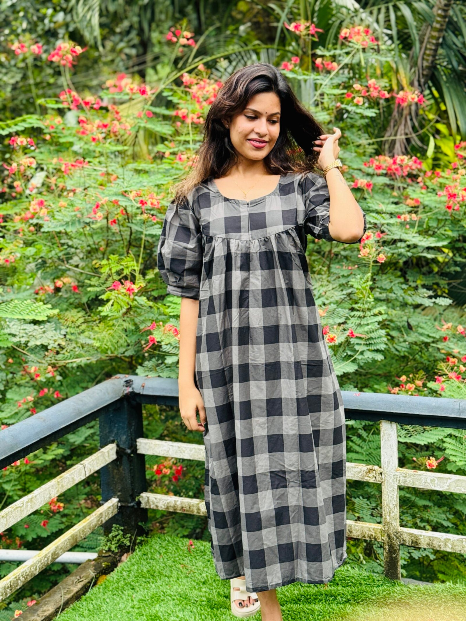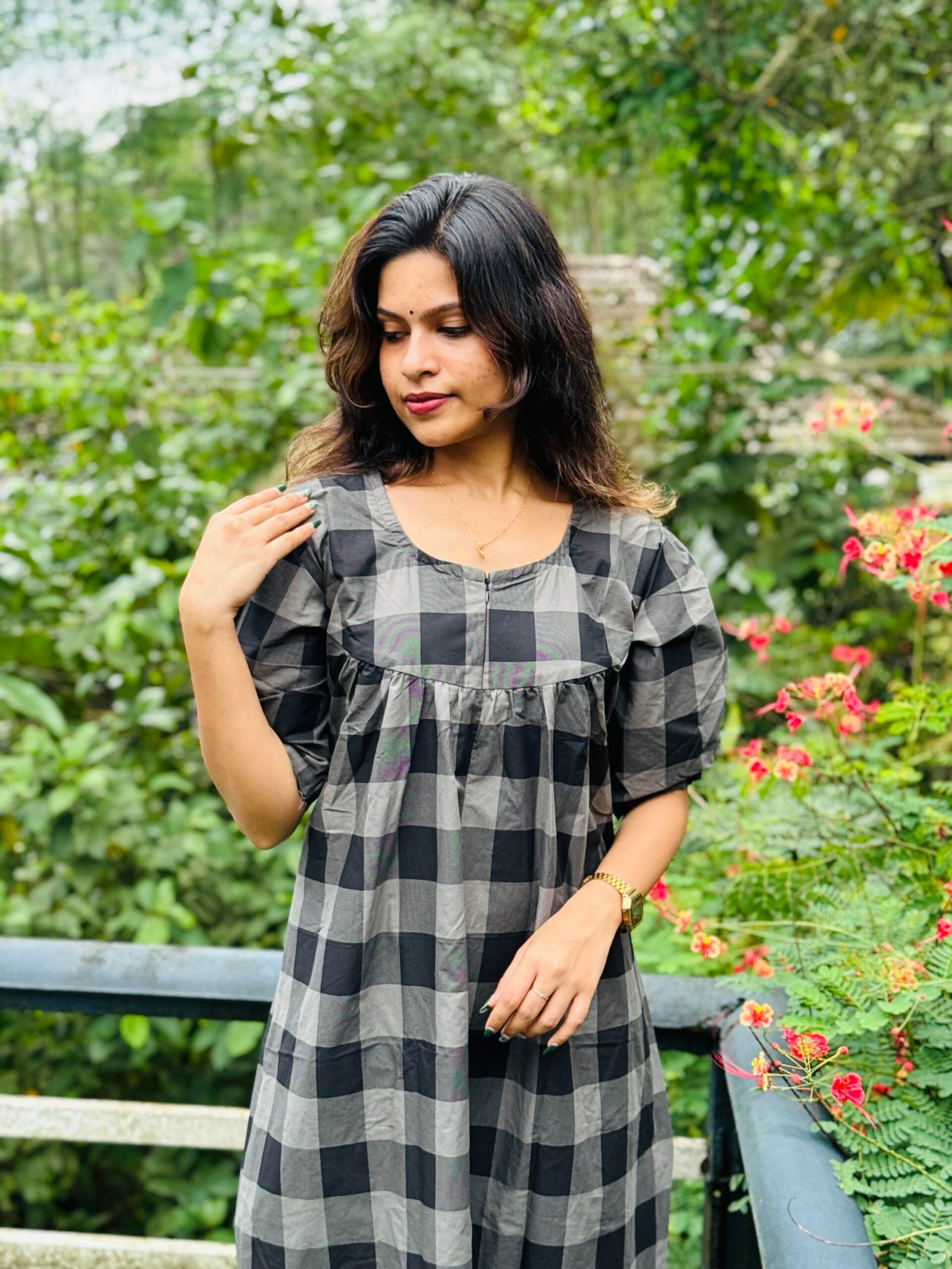 Stay stylish and comfortable with this versatile check-pattern cotton dress. Designed to suit both moms and non-feeding wearers, it features a convenient center zip and back ties for an adjustable fit.